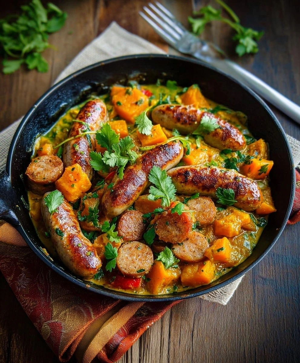 Kürbis ist reich an Beta-Carotin und Ballaststoffen, während Kokosmilch gesunde Fette liefert. Die Würstchen sorgen für Eiweiß, und insgesamt entsteht ein ausgewogenes, nahrhaftes Gericht, das dich sättigt, ohne zu beschweren. Ich liebe es, dass man sich danach rundum wohlfühlt.