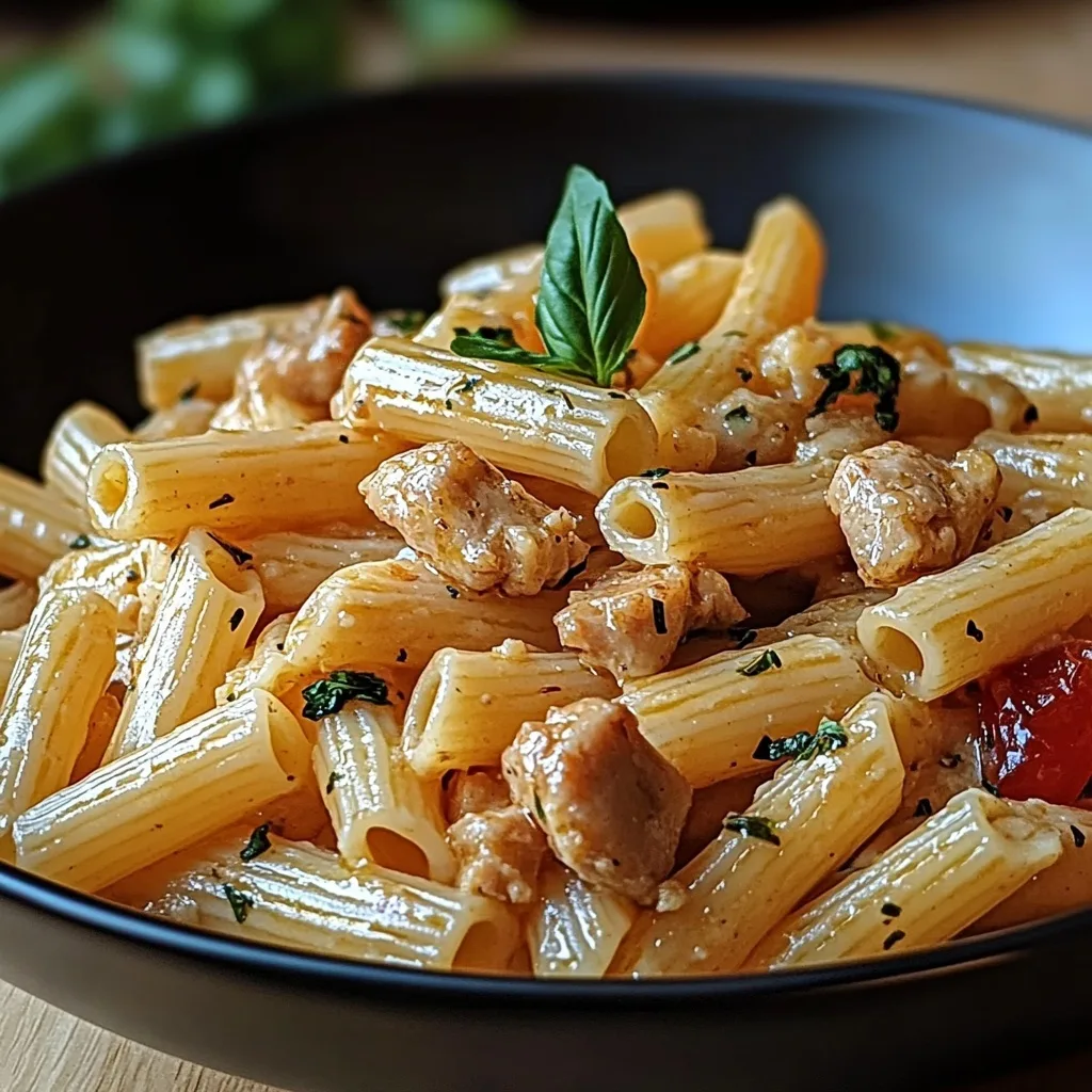 Du kannst die Penne durch Tagliatelle oder Fusilli ersetzen. Wenn du es etwas gesünder magst, probiere Vollkornpasta oder Zucchininudeln. Auch ein paar Brokkoliröschen oder Spinatblätter in der Sauce bringen Farbe und Frische hinein.