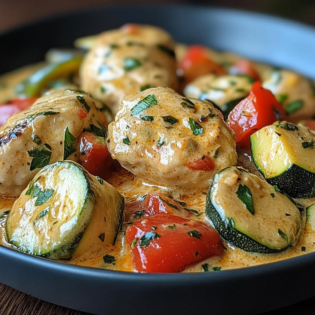 Der Clou liegt in der Kombination aus frischem Gemüse und milder Sahne. Die Zucchini bringt eine leichte Süße, während die Paprika für Farbe und ein leicht fruchtiges Aroma sorgt. Zusammen mit der sahnigen Sauce entsteht ein Gericht, das sich wunderbar mit Reis, Nudeln oder sogar Kartoffelpüree kombinieren lässt. Ich liebe, wie die Sauce beim Köcheln leicht eindickt und sich perfekt um jedes Stück Hähnchen legt.